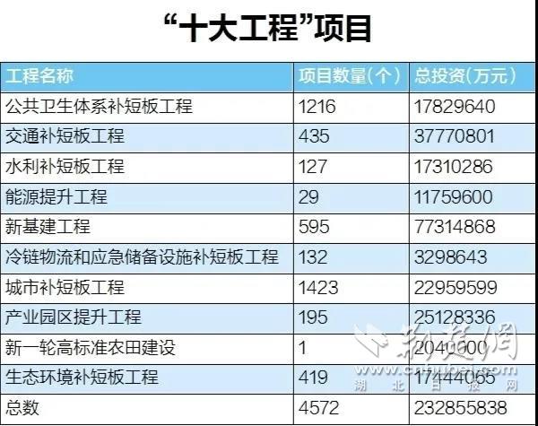 近日,湖北省印发《湖北省疫后重振补短板强功能“十大工程”三年行动方案(2020-2022年)》(以下简称《方案》),启动疫后重振“十大工程”。《方案》聚焦公共卫生体系、交通、水利、能源、新基建、冷链物流和应急储备设施、城市、产业园区提升、新一轮高标准农田建设、生态环境等十大领域,滚动项目库项目达4572个,估算总投资约2.3万亿元。