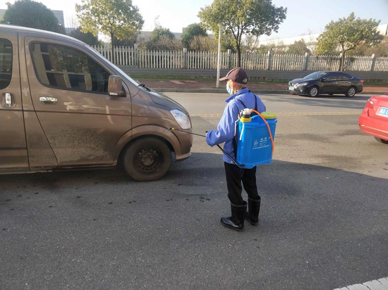 他们每天背着几十斤重的消杀设备,顶着药物的腐蚀,穿梭在园区开展公共区域消杀。