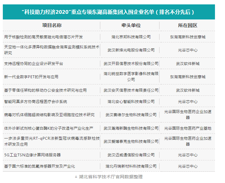 荆楚网客户端—荆楚网消息(通讯员 付裕)近日,湖北省科学技术厅根据《科技部关于“科技助力经济2020”重点专项有关事项的通知》要求,公布了我省“科技助力经济2020”重点专项立项项目清单,共有219个项目入列。其中,东湖高新集团武汉、鄂州园区共有11家企业项目入选。