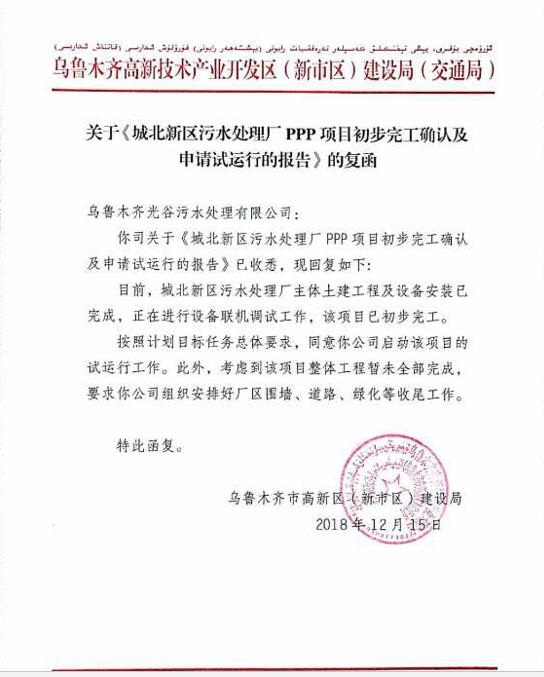 (通讯员 乌鲁木齐城北水厂 任斐斐)2018年12月15日下午,城北水厂迎来喜讯,将近两年的工程施工期,在集团领导的大力支持和城北水厂团队的不懈努力下,取得了重要的阶段性成果,初步完工已确认。乌鲁木齐高新区(新市区)建设局发函“关于《城北新区污水处理厂PPP项目初步完工确认及申请试运行的报告》的复函”至乌鲁木齐光谷环保污水处理有限公司,并对城北水厂自2017年5月动工以来的施工工作给予了充分肯定,为接下来进入正式商业运营打下了坚实的基础。