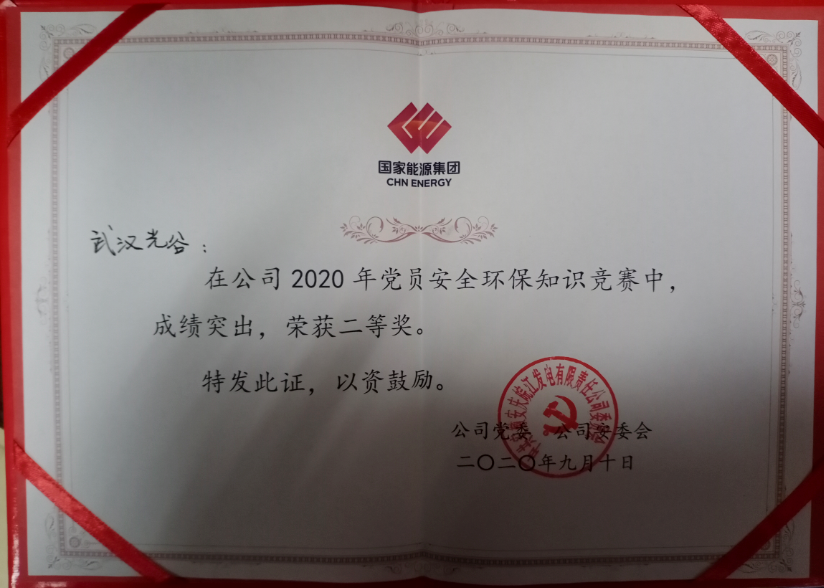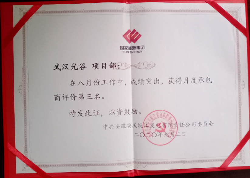 (通讯员 安庆分公司 毛明明)2020年9月5日,光谷环保安庆分公司荣获业主单位神皖安庆电厂“八月之星”月度第三名,9月10日获得全厂安全环保知识竞赛二等奖。这是继7月份荣获神皖安庆电厂表彰后,分公司全体员工上下一心不骄不躁继续前行体现。