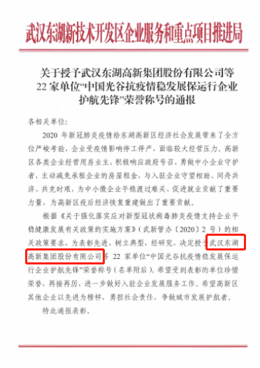 在疫情防控阻击战和复工复产保卫战中,东湖高新集团始终服务于疫情防控的大局,在积极承担社会责任的基础上,稳妥组织企业生产经营。一手抗疫情,一手稳发展,全力支持园区企业恢复生产经营,为企业保驾护航,赋能后疫情时代实体经济的高速、高质量发展,彰显了国有企业和上市企业的使命和担当。